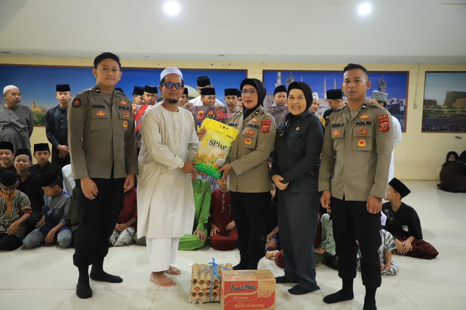 Personel Bid Humas Polda Jabar menyerahkan bantuan sosial berupa paket sembako untuk kebutuhan sehari – hari bagi para santri dan pengurus pondok pesantren.