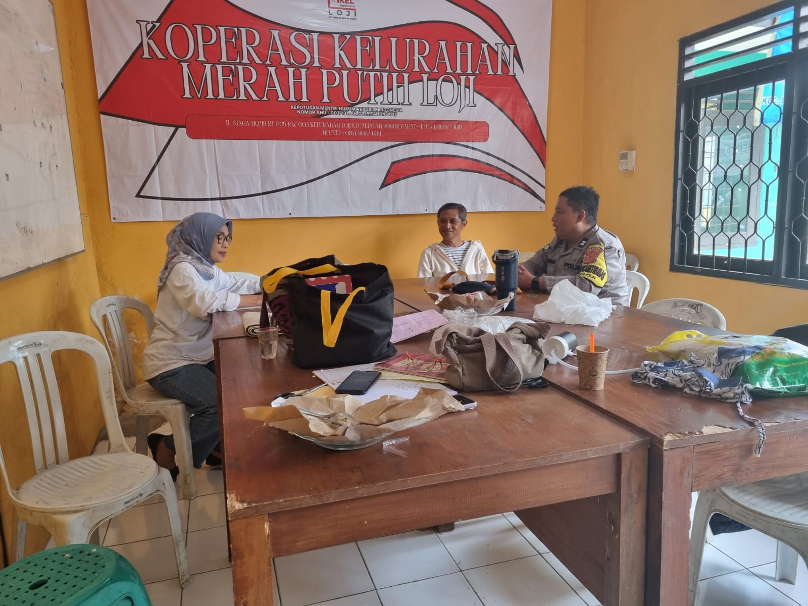Berlokasi di Kantor Koperasi Merah Putih (KMP) RW 3 Kelurahan Loji Bogor Barat, terlihat Bhabinkamtibmas Aiptu Suherman, lakukan sambang Kepada Bapak Yana selaku pengurus KMP, upaya menyatukan persepsi dalam memberikan yang terbaik pada masyarakat.