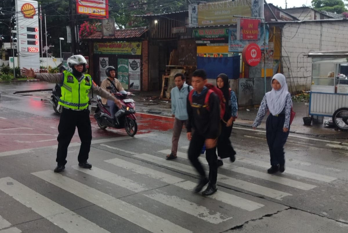 Kota Bogor- Anggota unit Lantas Polsek Tanah Sareal melaksanakan kegiatan pengaturan Lalu lintas dan membantu menyeberangkan anak sekolah di pagi hari di Jalan Soleh Iskandar Kota Bogor.